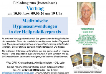 Vortrag "Medizinische Hypnoseanwendungen in der Heilpraktikerpraxis" am 10.03.2026 in Lahr (DRK/Nestlecarreé) um 19 Uhr